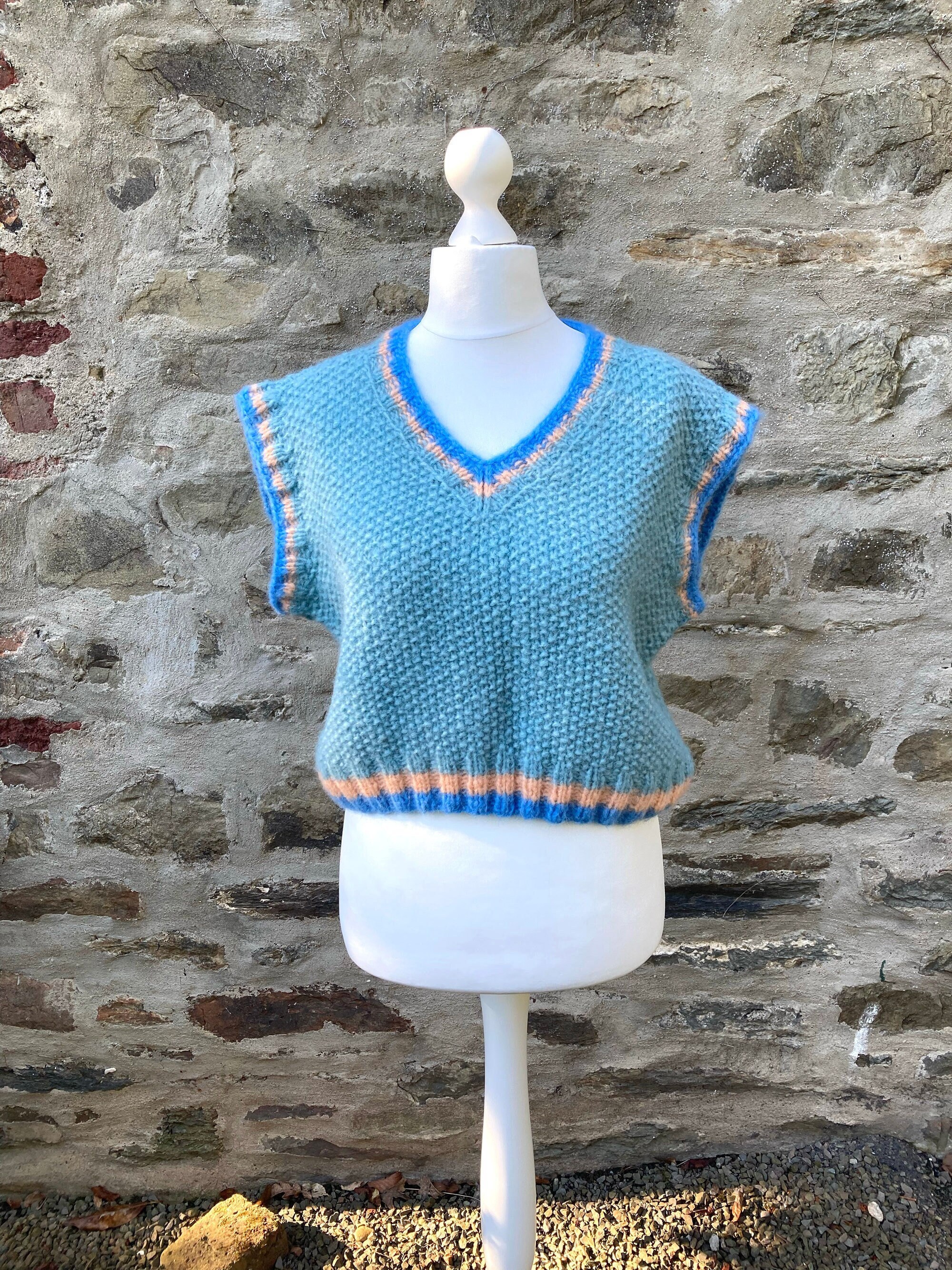 An alpaca dream: a hand-knitted pullover in a super fluffy, soft (and lightweight) alpaca and virgin wool blend. Premium alpaca wool. A light blue base color is framed by salmon and medium blue cuffs. Sizes 38-40. Lightweight and casual, perfect for wearing with blouses or shirts. Size 38 DE. Hand wash, dry flat.