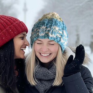 Elegant knitwear charm is in! Hand-knitted with a double cable pattern. High-quality, soft wool blend (50% merino wool, 50% polyacrylic). With a large, fluffy faux fur pom-pom.