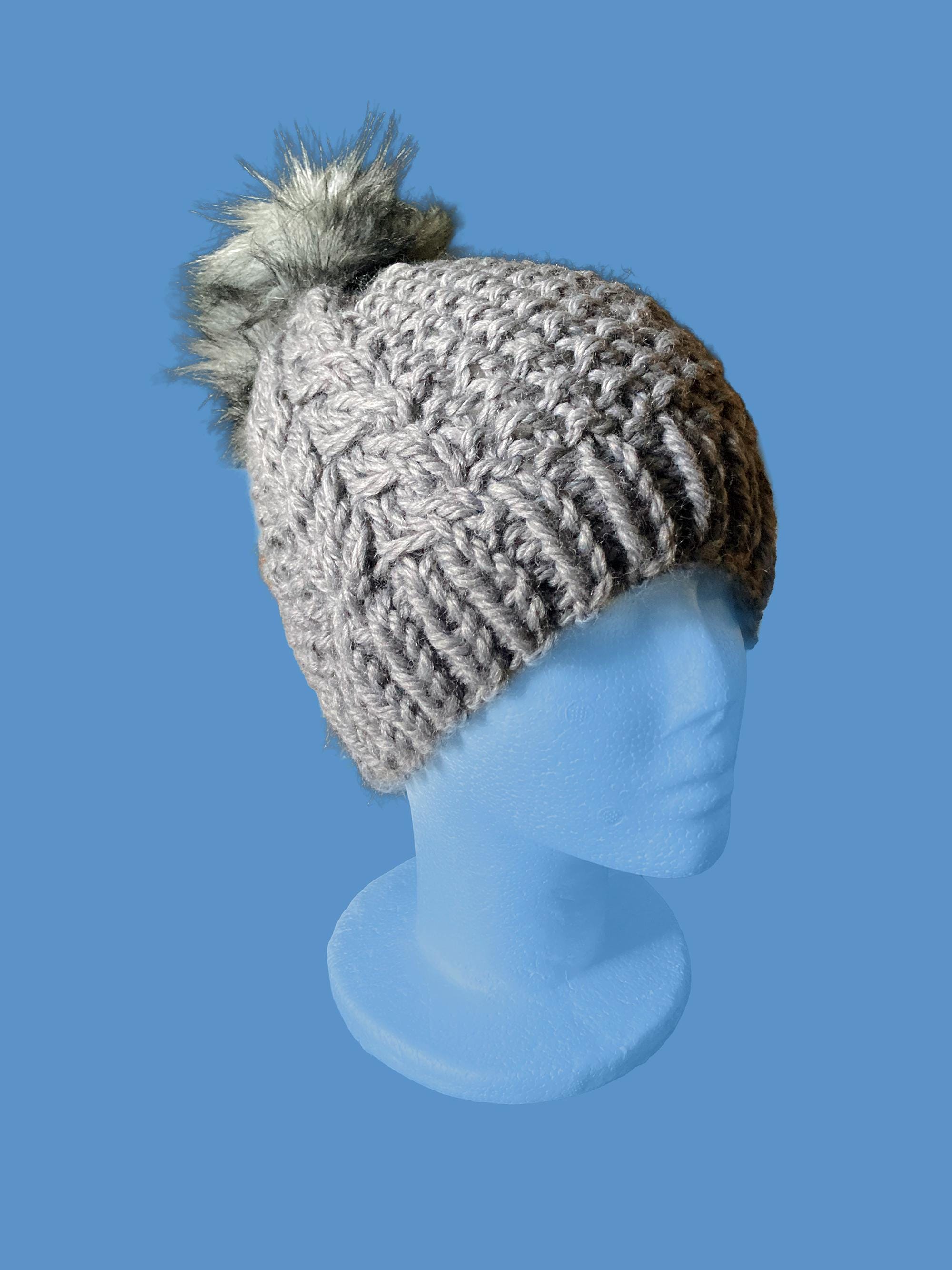 Elegant gray knitted hat with a plush pompom. Hand-knitted with a cable pattern in a sophisticated gray and anthracite. One size fits all (56-59 cm).