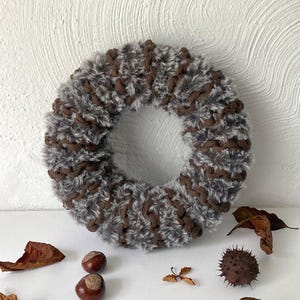 This wreath is a unique, hand-knitted piece, lovingly crafted from high-quality, soft fake fur yarn.