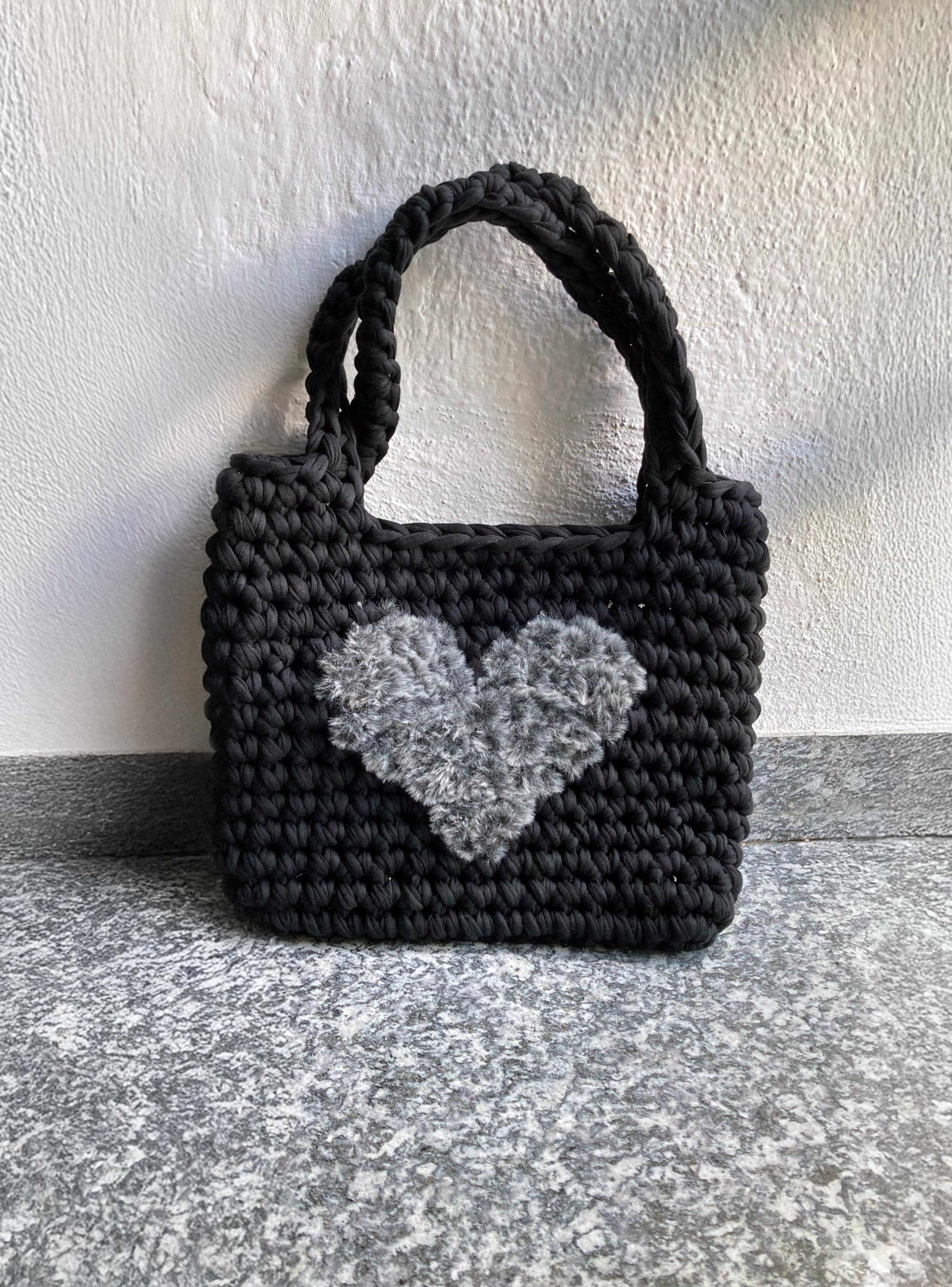 Crocheted shopper bag with a cuddly teddy bear heart appliqué in anthracite! Crocheted in elegant black. Unique piece made from textile yarn. One of a kind!