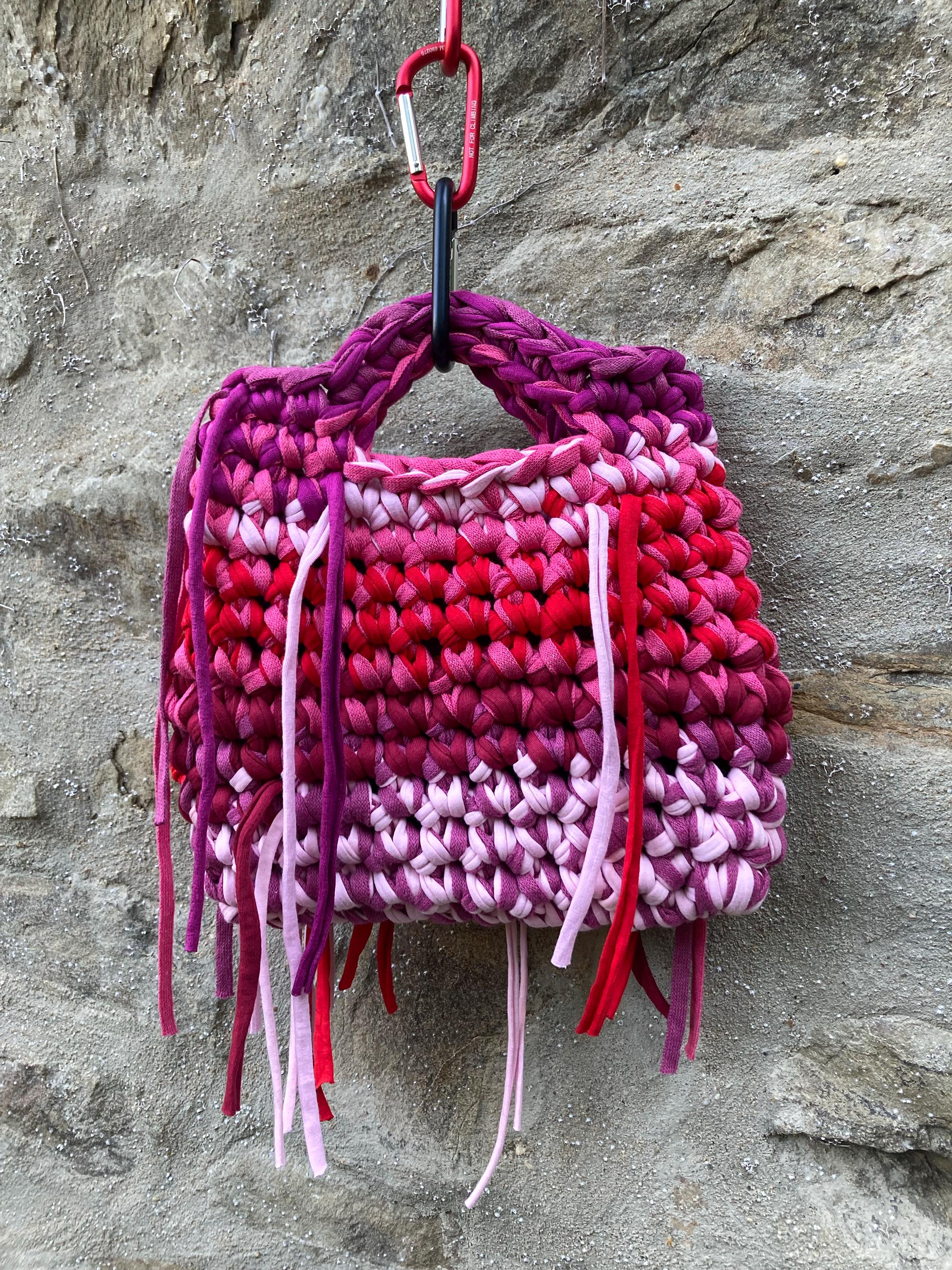 This gorgeous handbag is perfect for true pink fans! A unique piece, lovingly hand-crocheted from recycled cotton yarn (sustainable!) in delicate colors ranging from powder pink to vibrant red and purple. It features cool fringes and a super-fluffy 3D crochet flower charm on top!