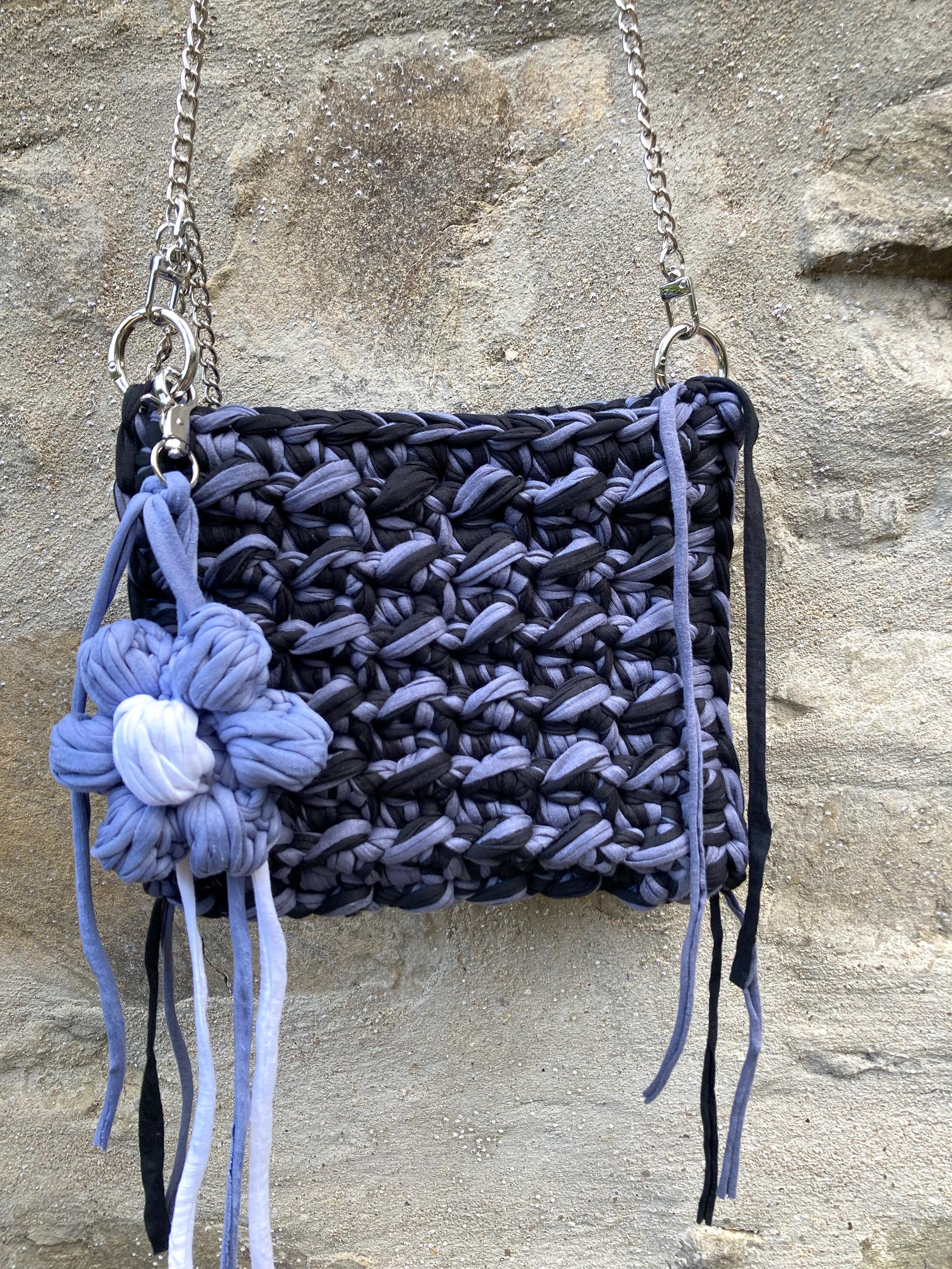 Elegant blue crocheted crossbody bag with a beautiful XXL flower charm! Includes a silver-look metal crossbody chain!