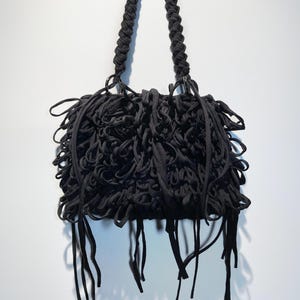 A crocheted bag with the best chance of becoming your favorite. A fantastic, one-of-a-kind handmade piece made from recycled t-shirt yarn. Includes a long crocheted crossbody cord. Urban street style at its finest. Also makes a great gift!