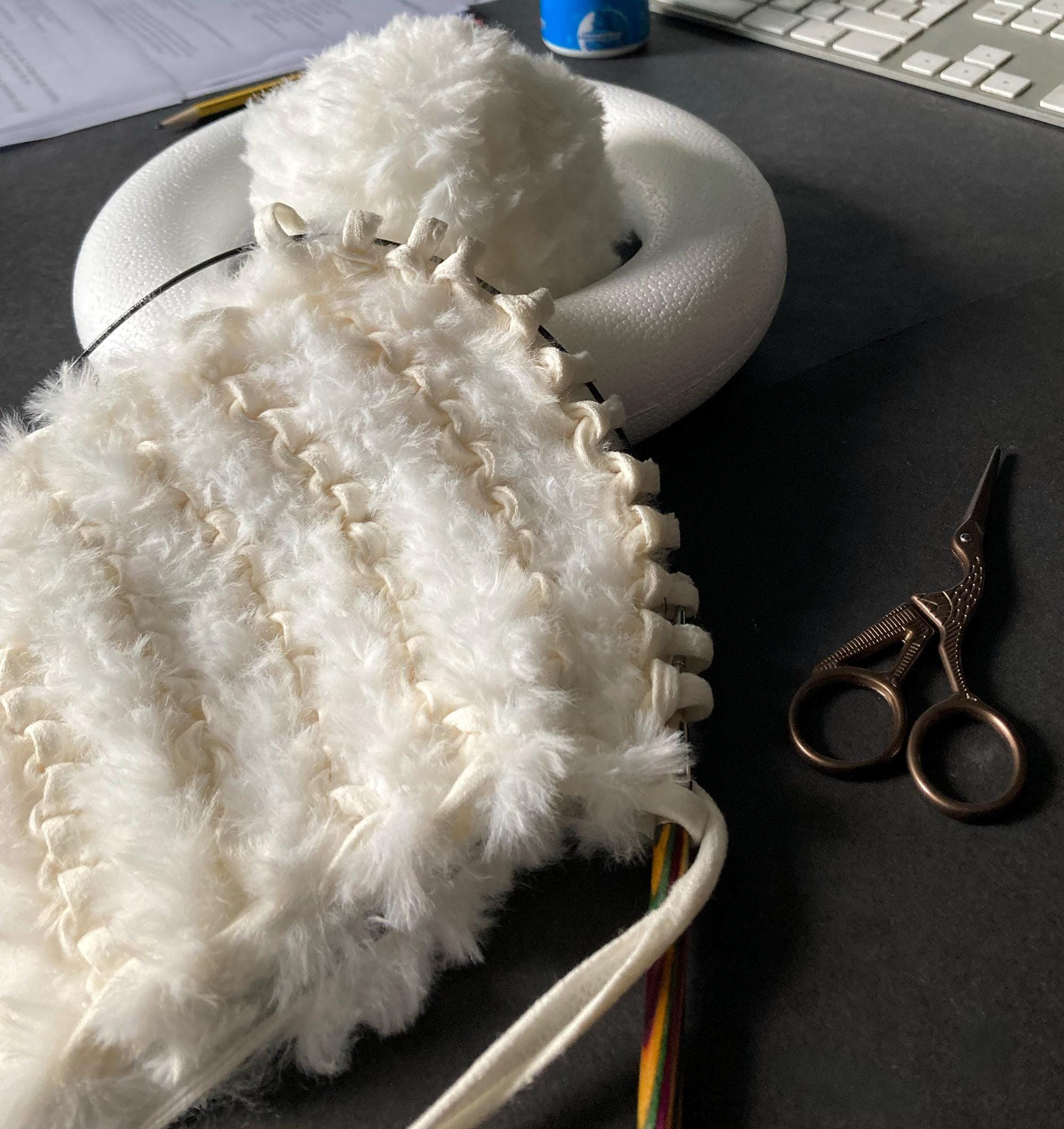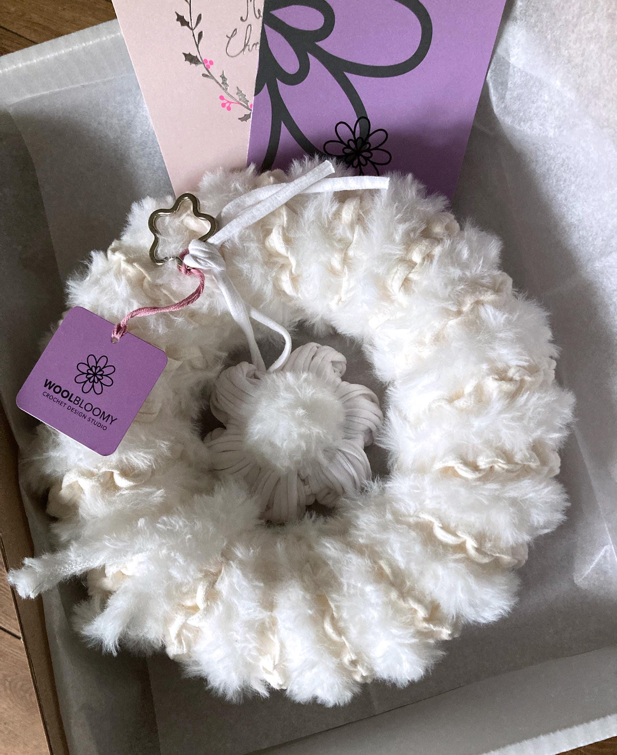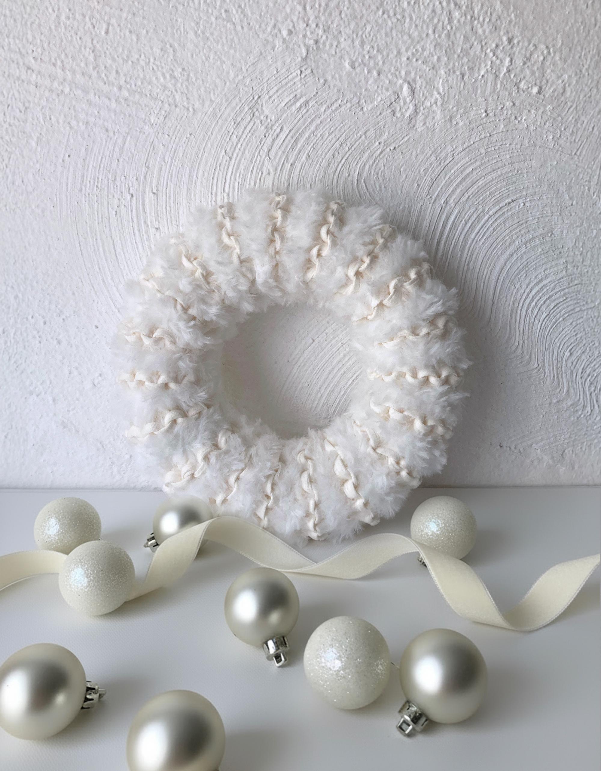 This wreath is a unique, hand-knitted piece. Lovingly handcrafted from high-quality, soft fake fur yarn. Wonderfully plush