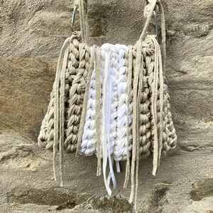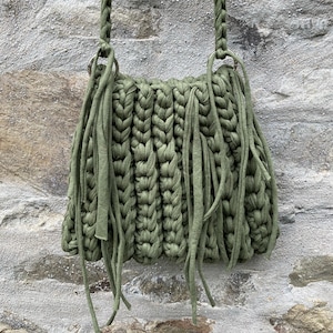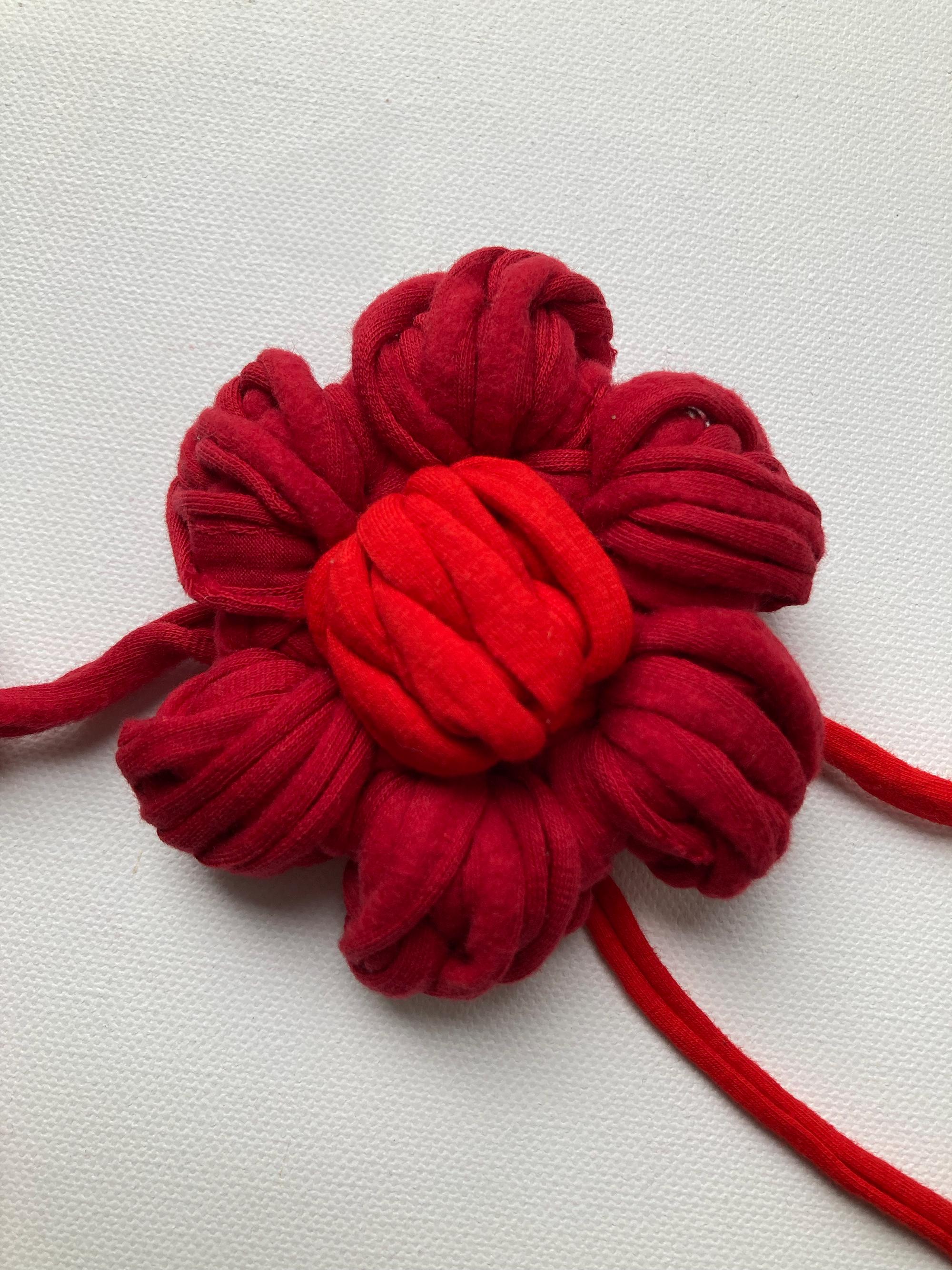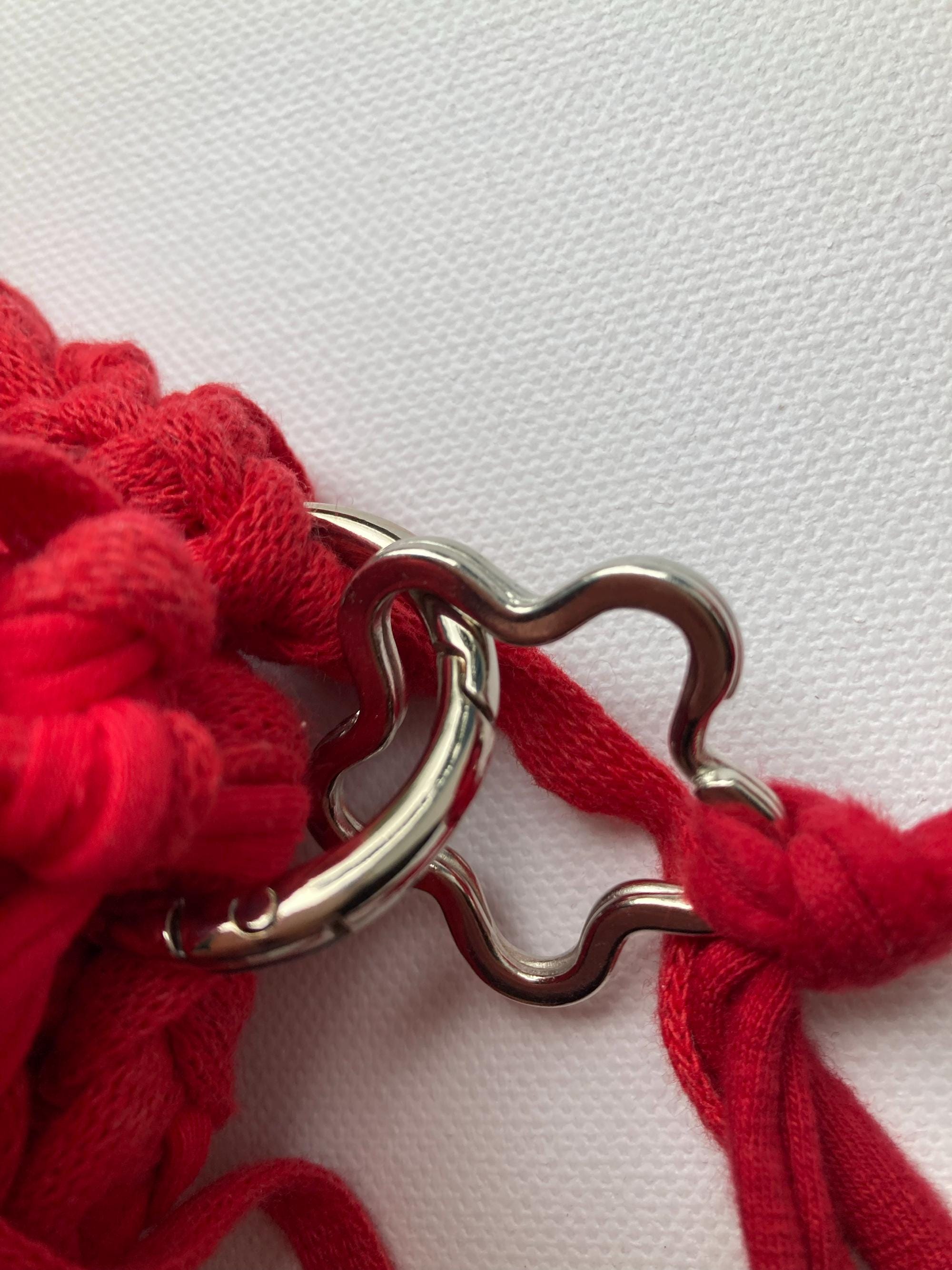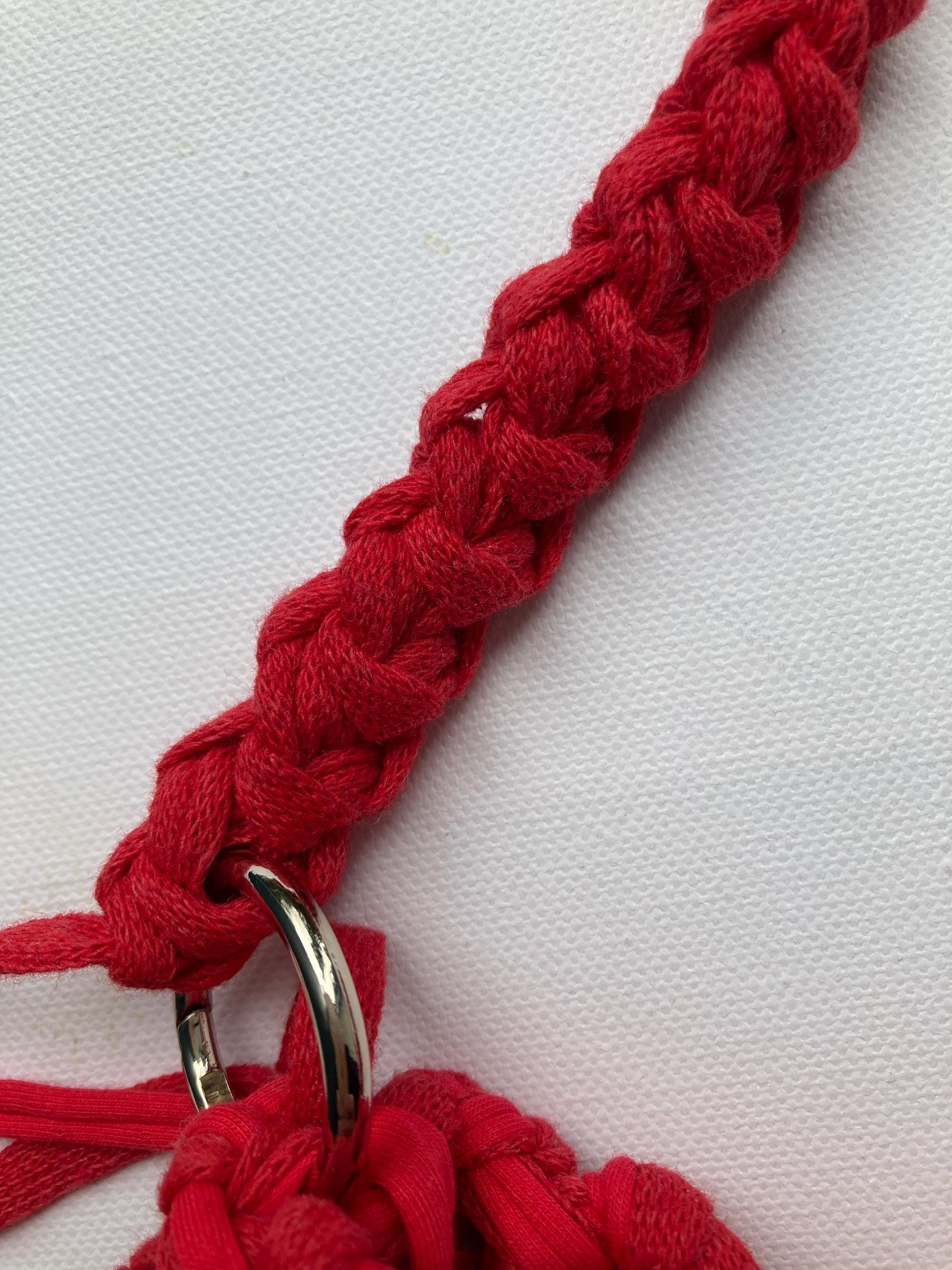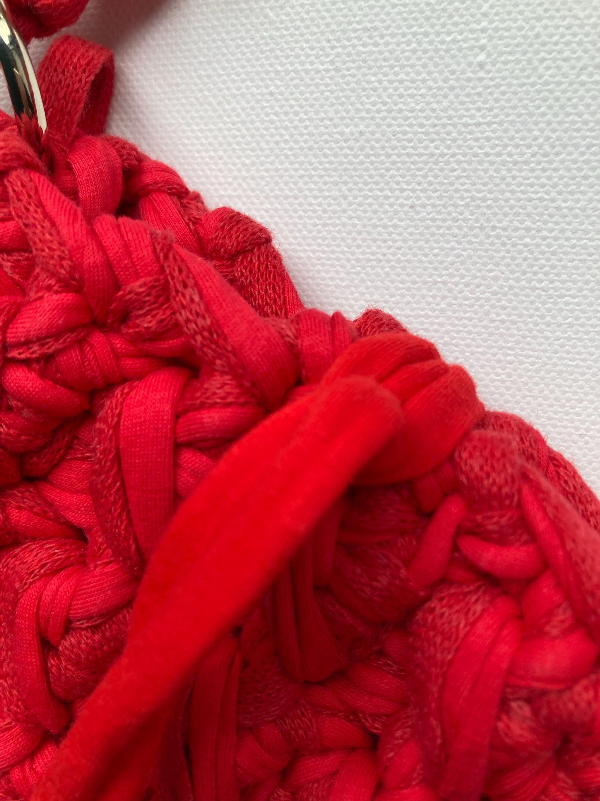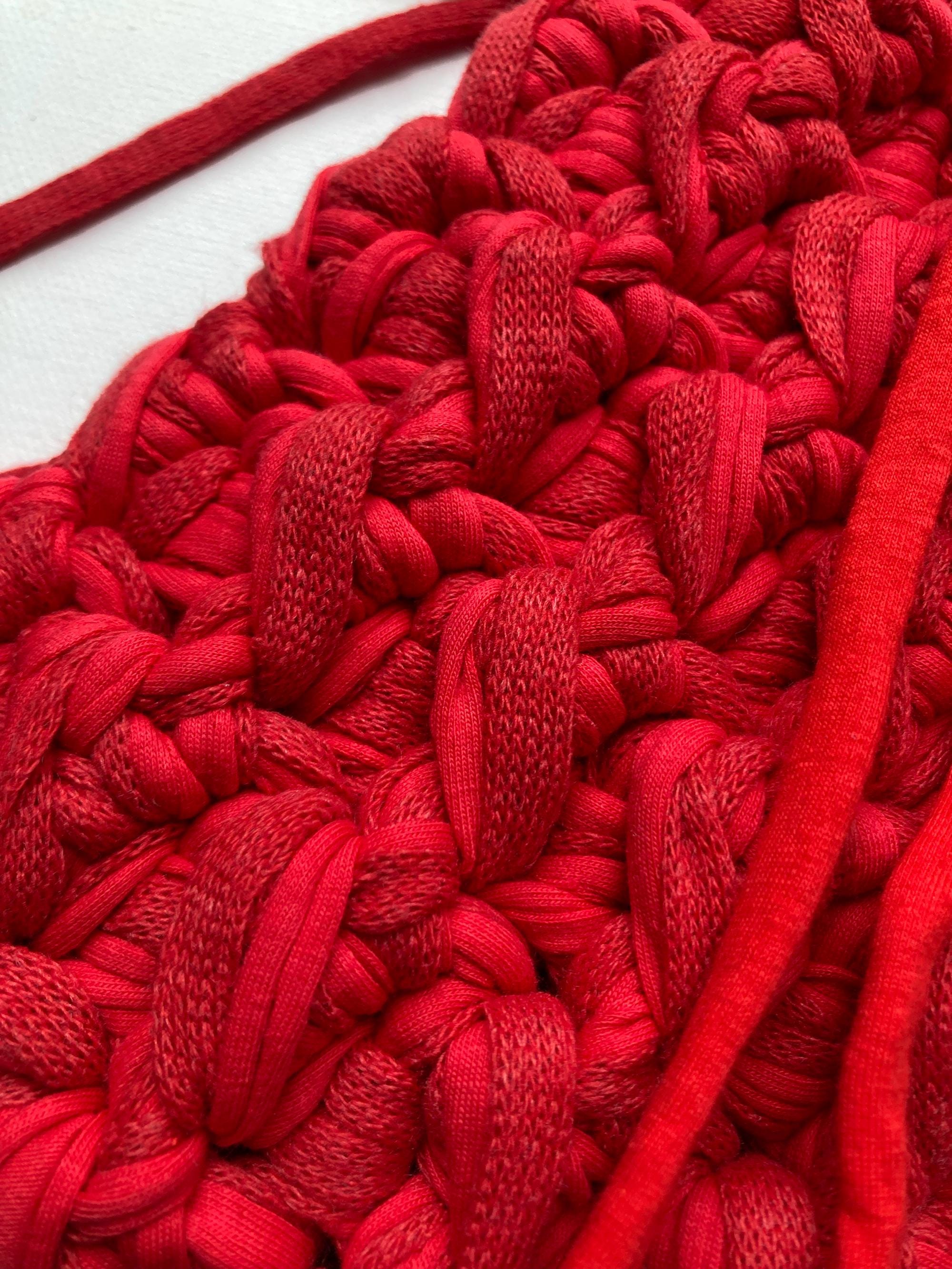 A unique piece, lovingly hand-crocheted from recycled T-shirt yarn.