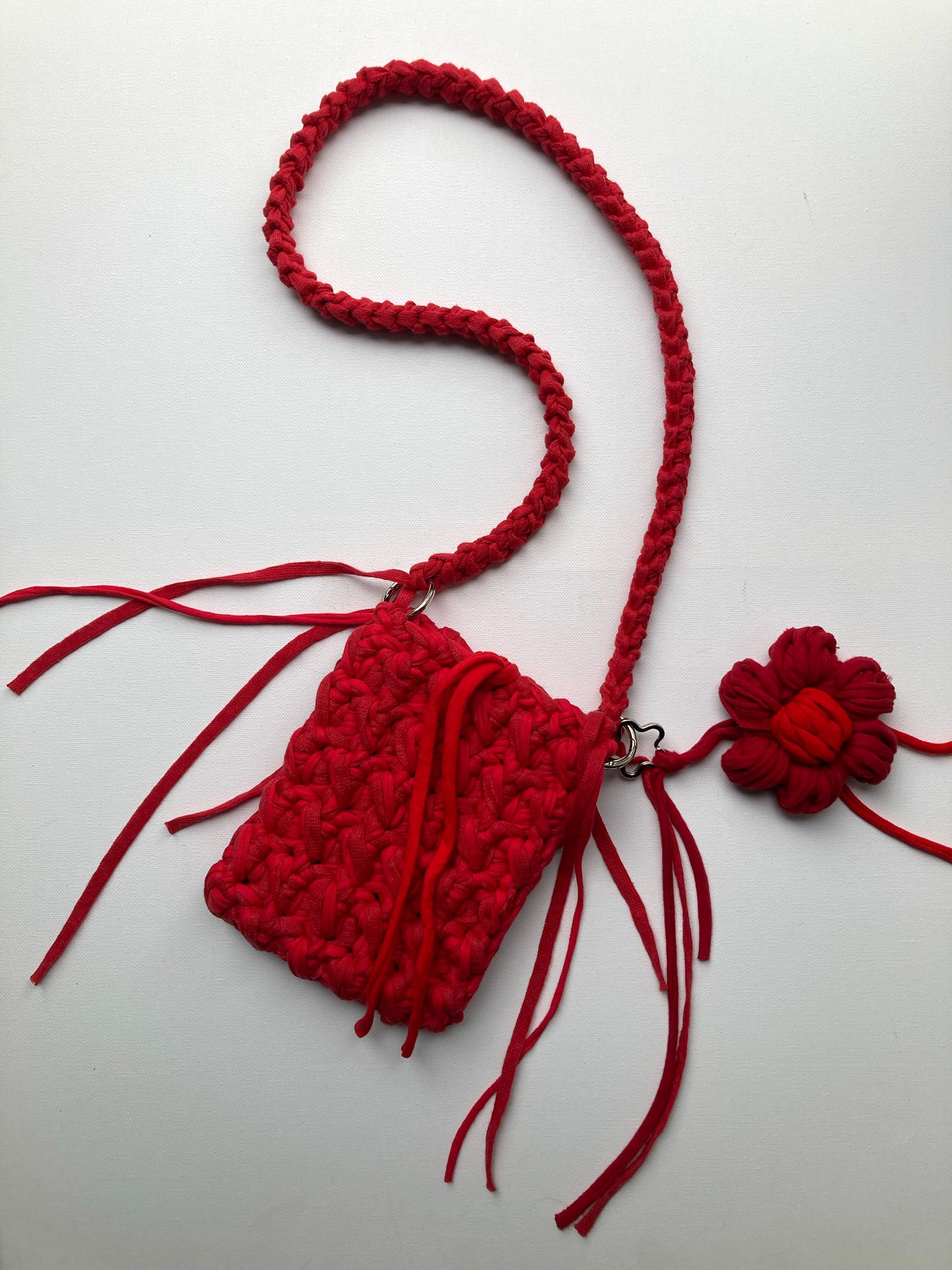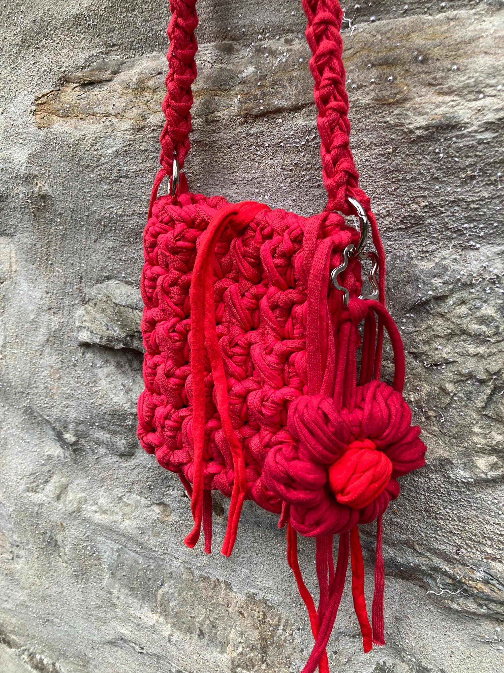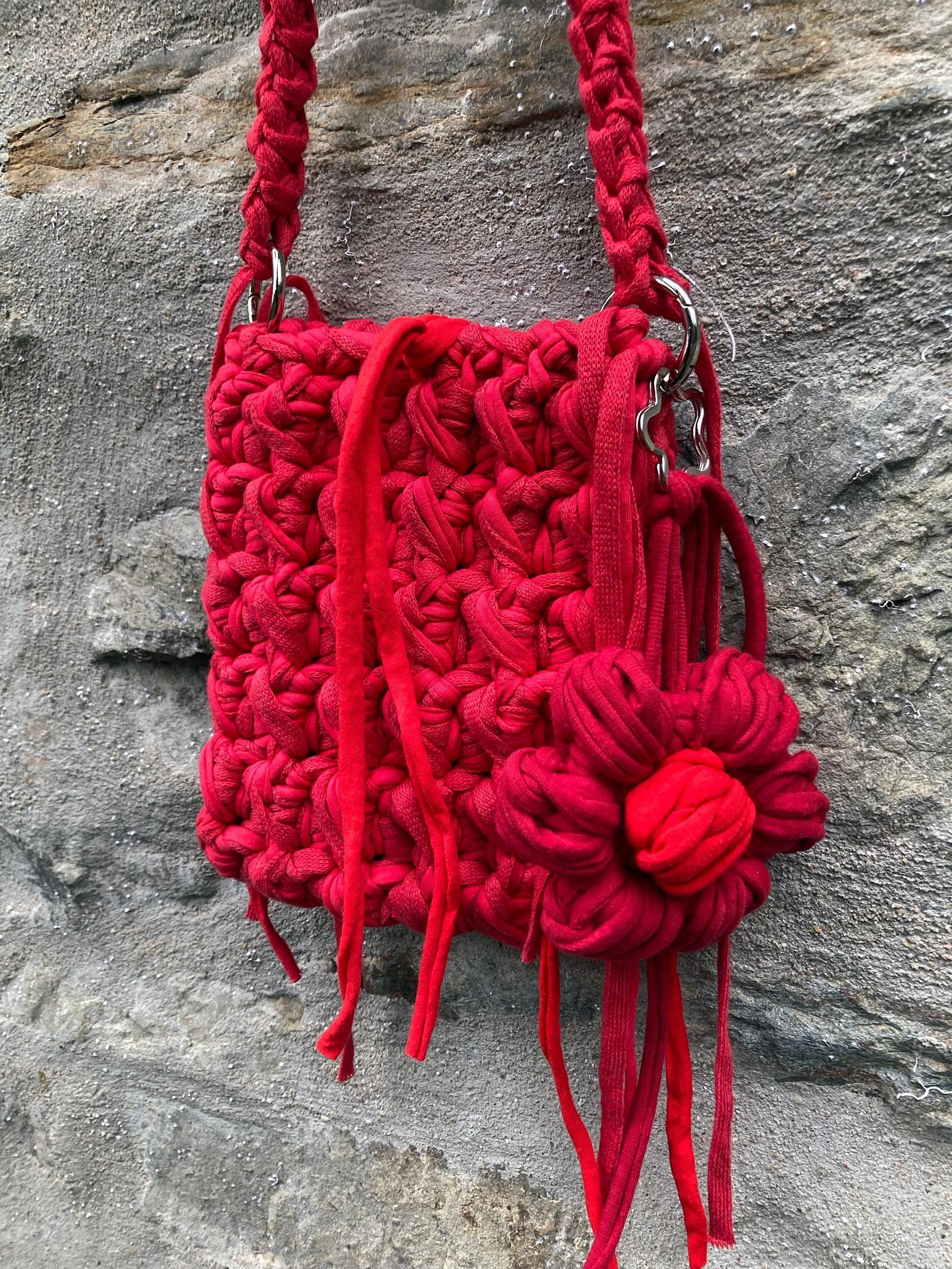 Designer crossbody bag in red with a cool XXL flower charm! Elegantly crocheted bag – mega urban street style! Premium handmade one-of-a-kind piece.