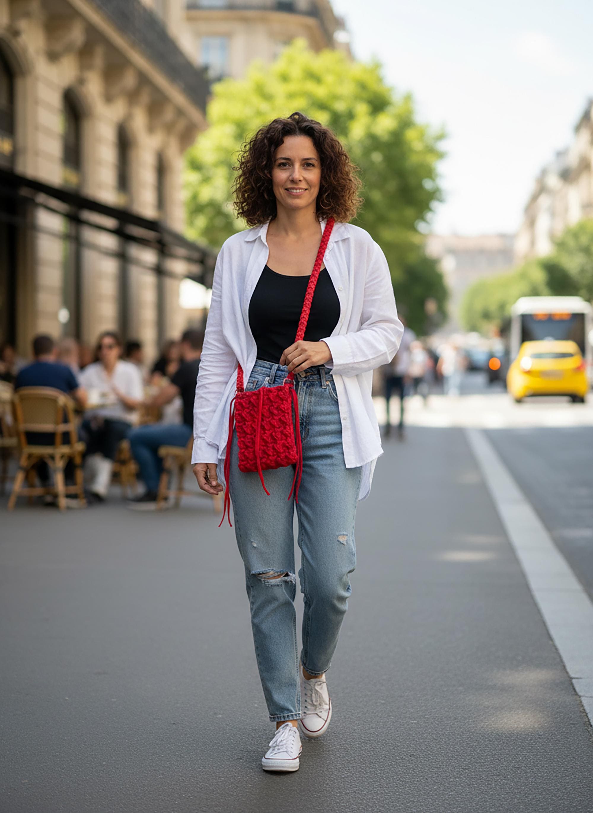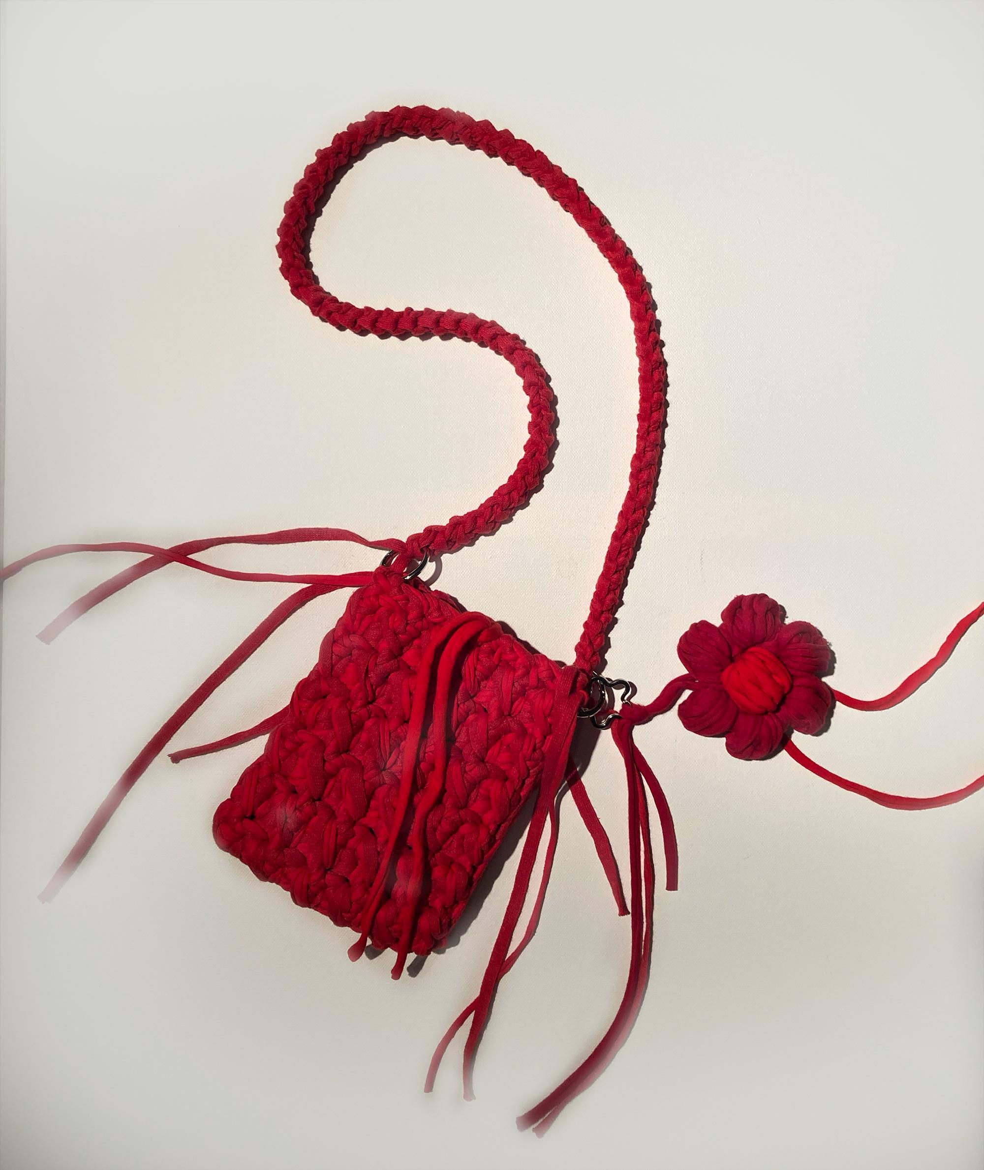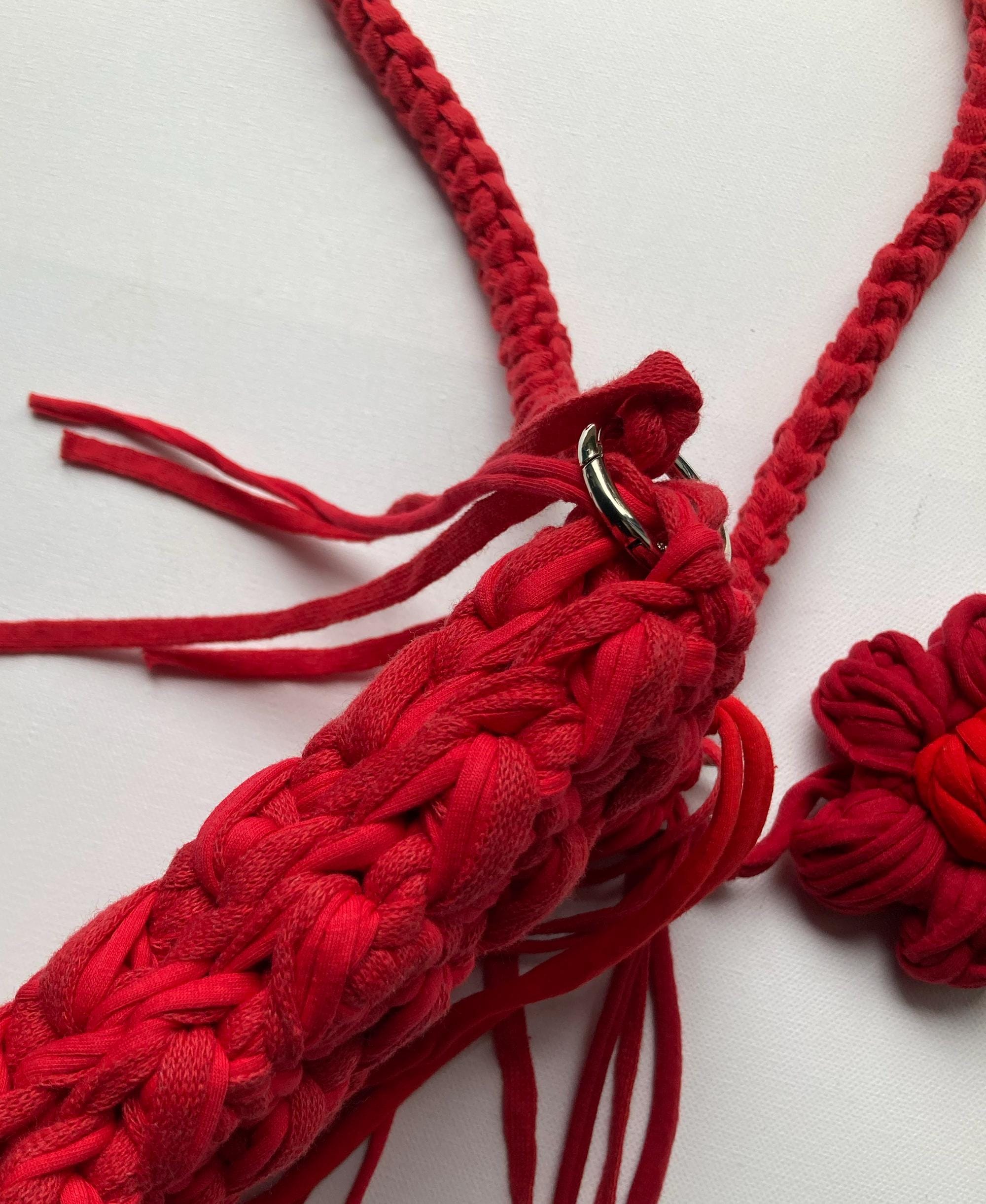 Designer crossbody bag in red with a cool XXL flower charm! Elegantly crocheted bag – mega urban street style! Premium handmade one-of-a-kind piece.