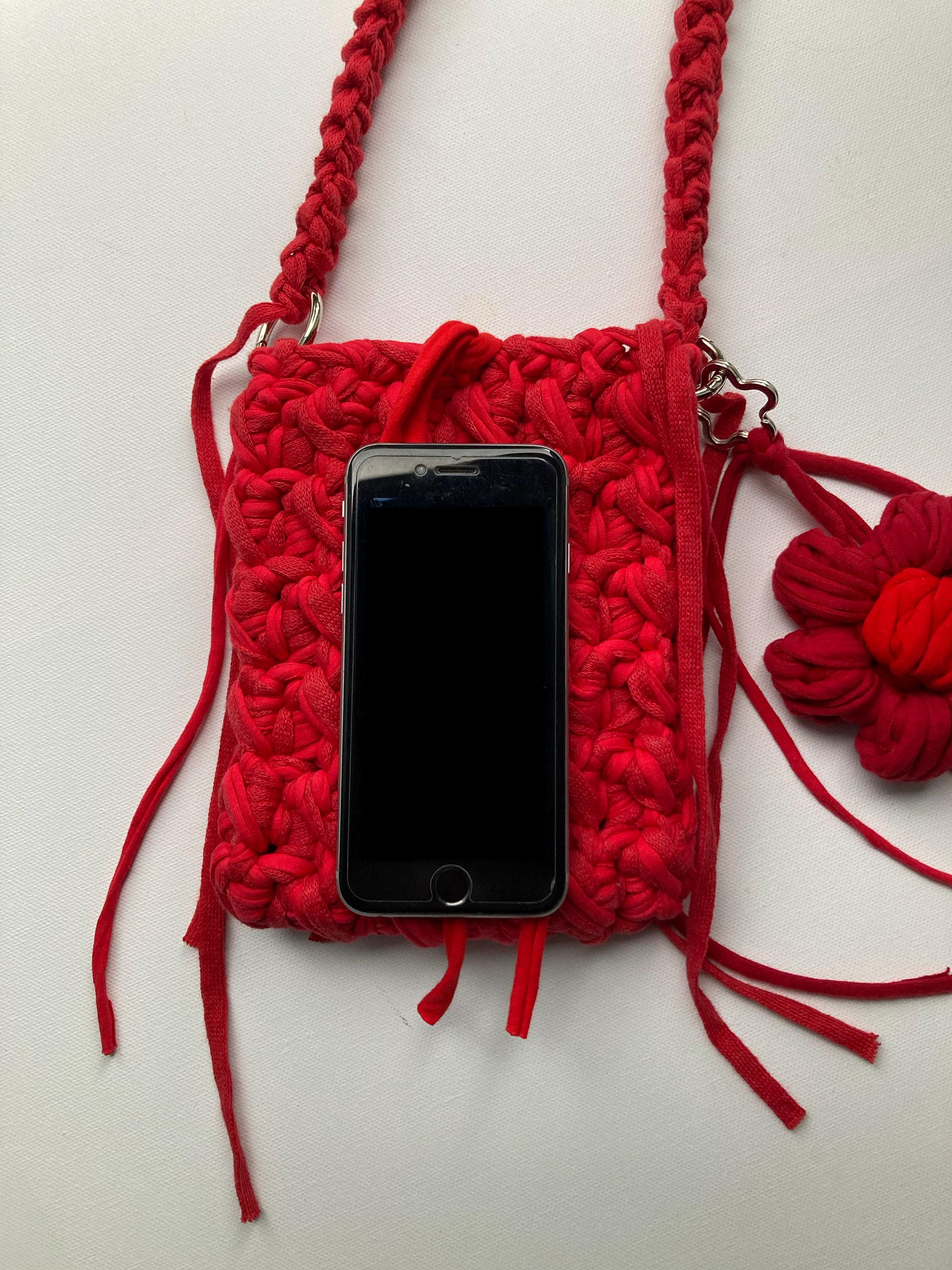 This crocheted crossbody bag has that extra touch of elegant coolness! In a gorgeous, vibrant red with a lovely crocheted carrying cord and a sweet Happy Flower charm on top!