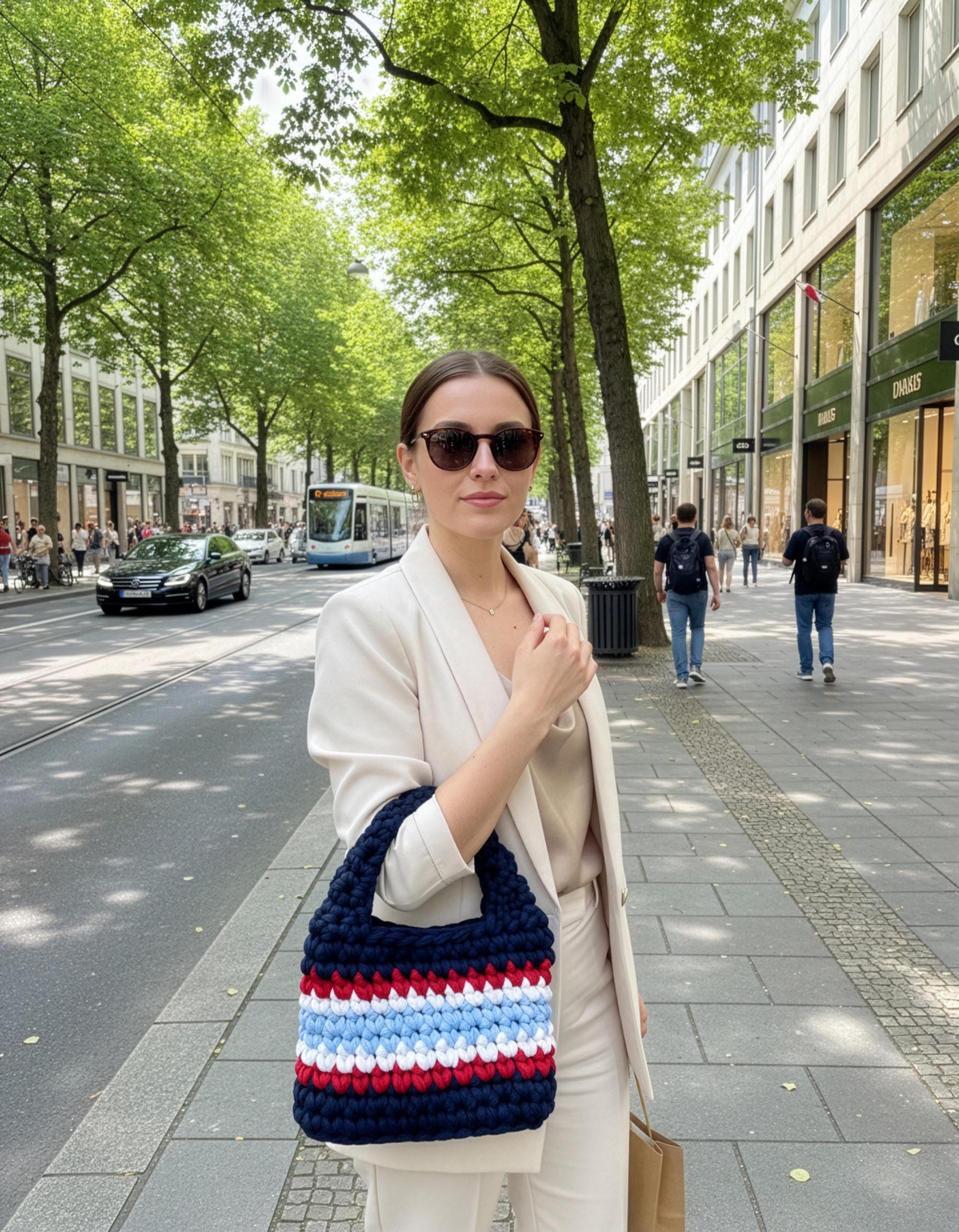 A stunning color design in a classic style! Dark blue meets stripes in light blue, red, and white. A distinctive, classy design for a handmade mini shopper bag for the modern woman with a flair for the extraordinary, a touch of extravagance!