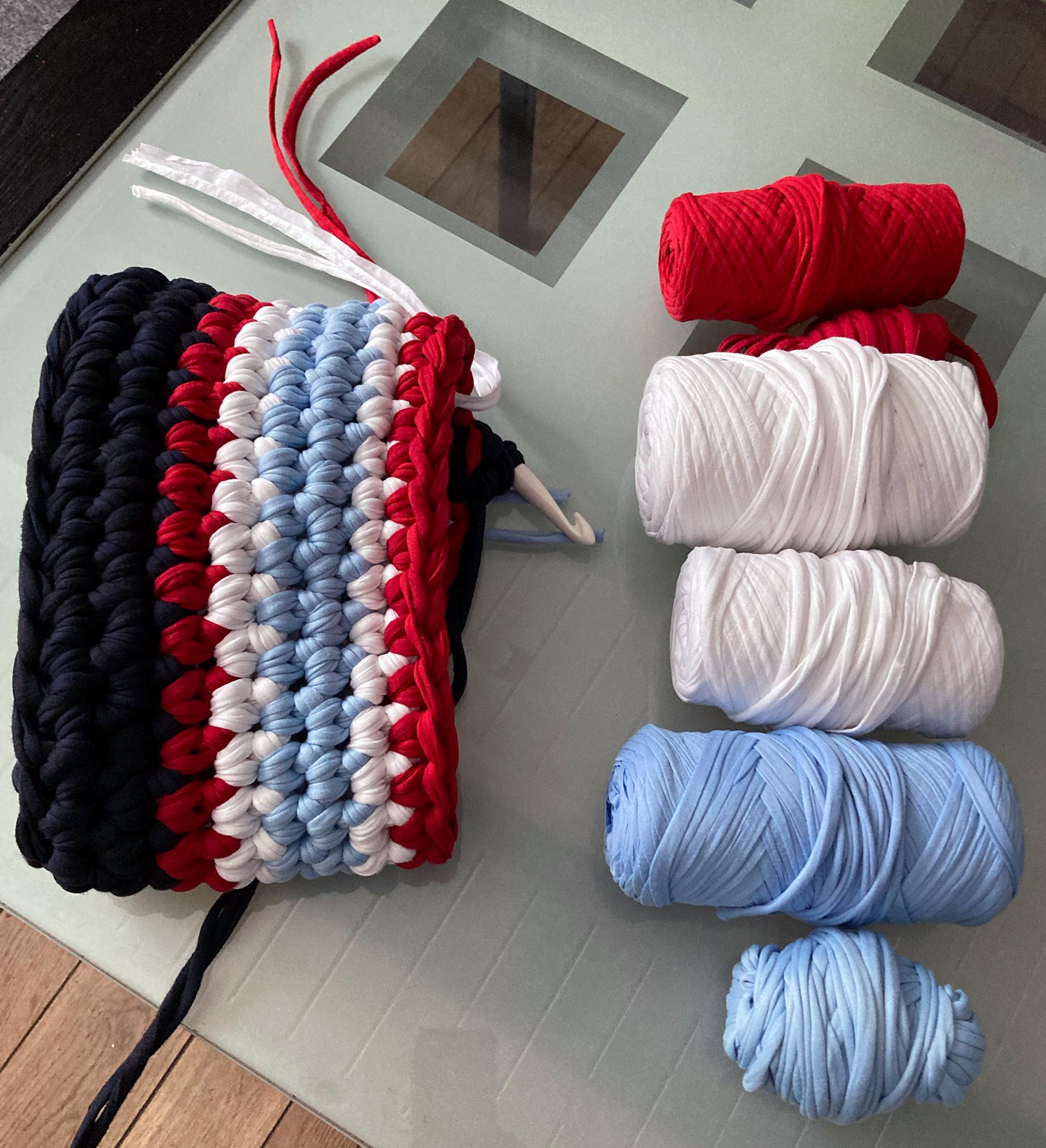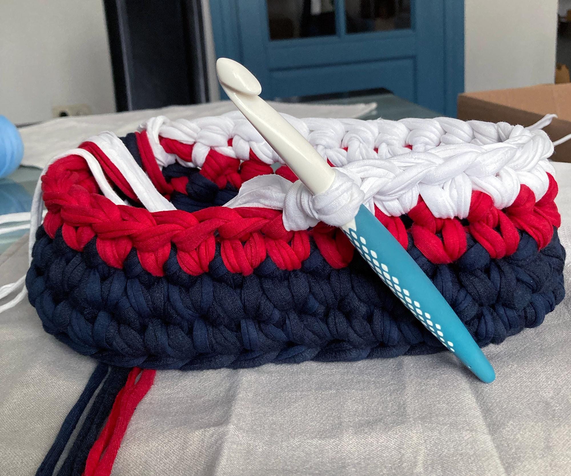 A unique item lovingly hand-crocheted from recycled T-shirt yarn (sustainable)!