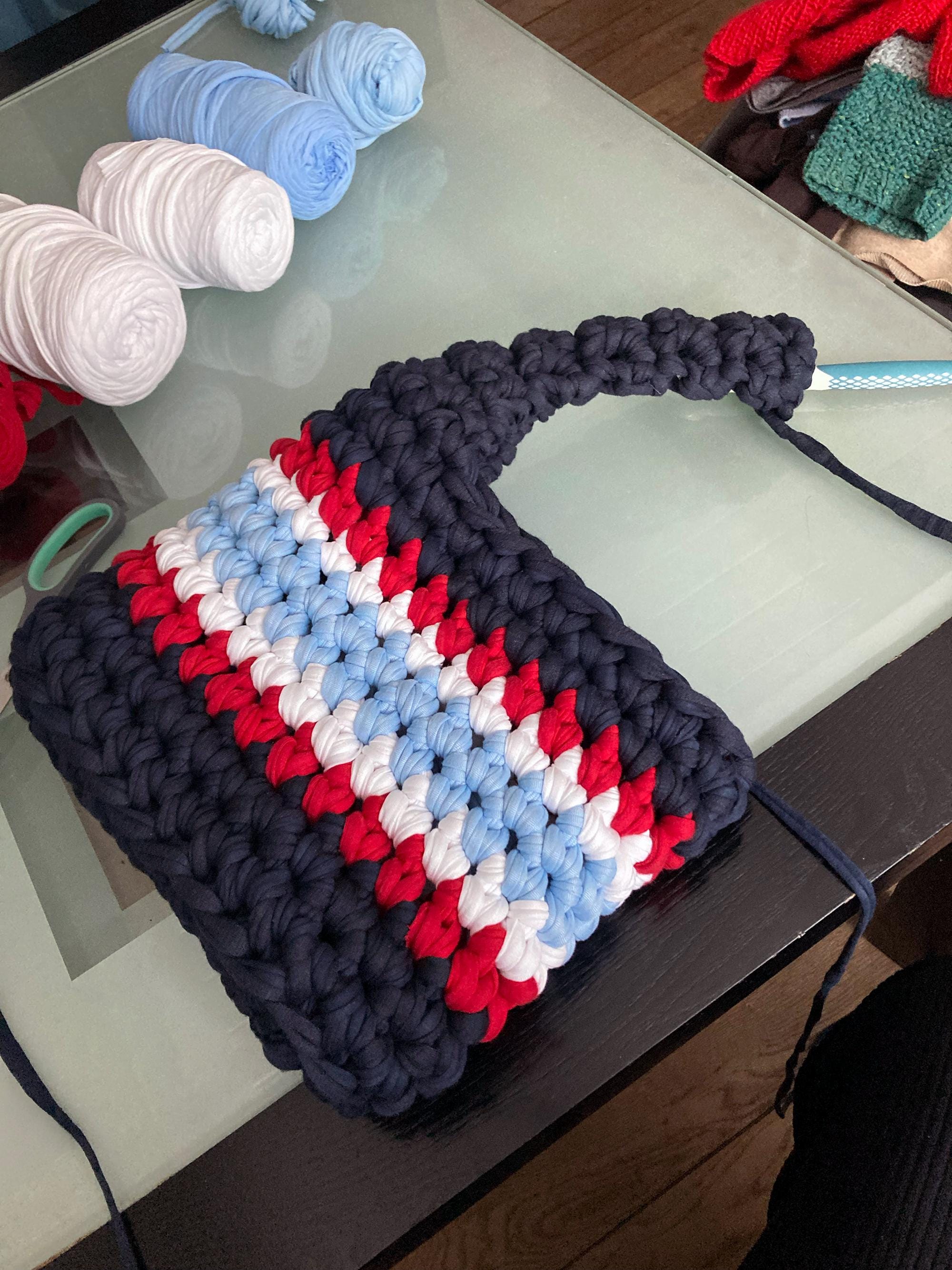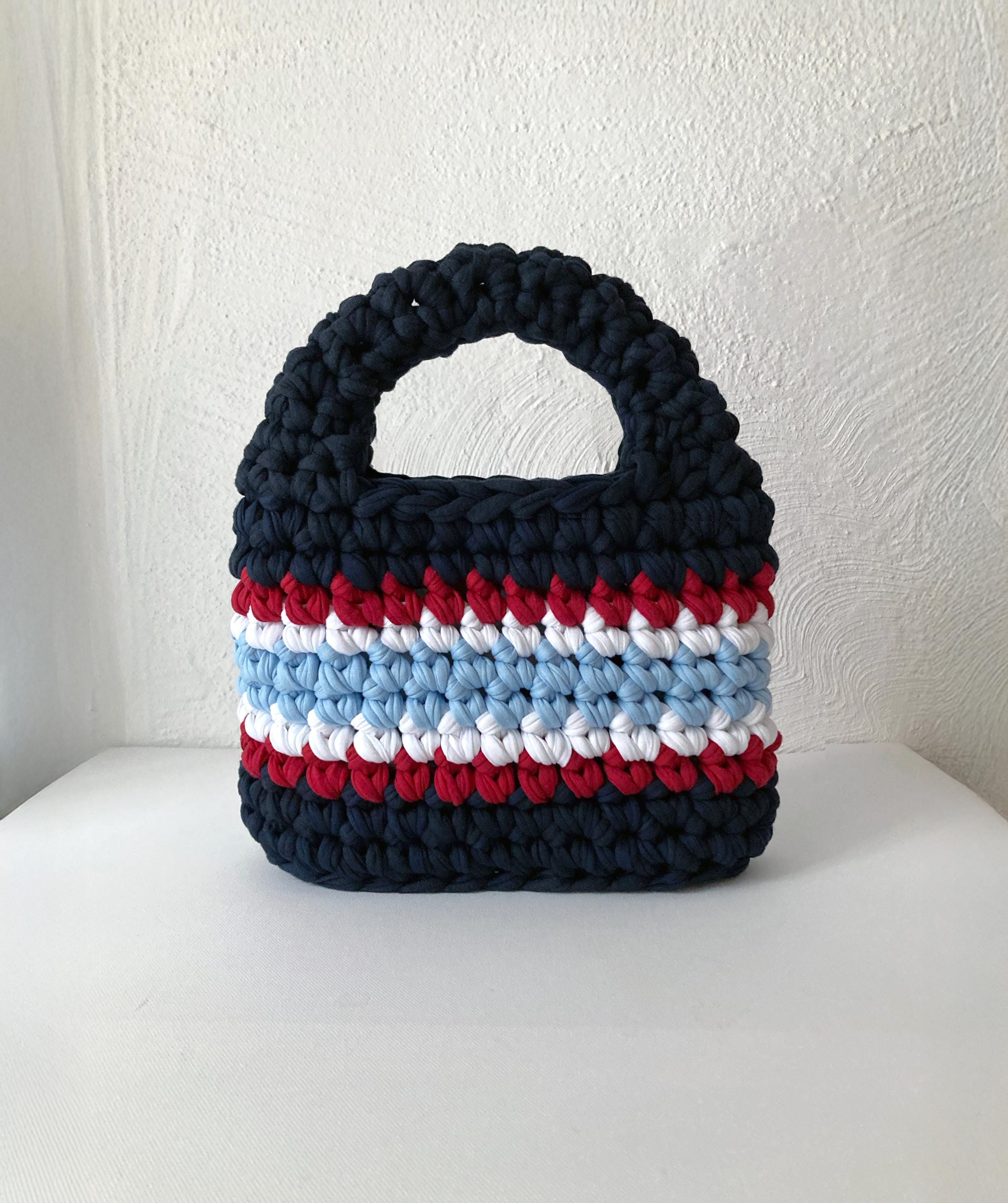 Elegant crocheted handbag in classic colors blue, red and white! Handmade mini shopper, one of a kind.