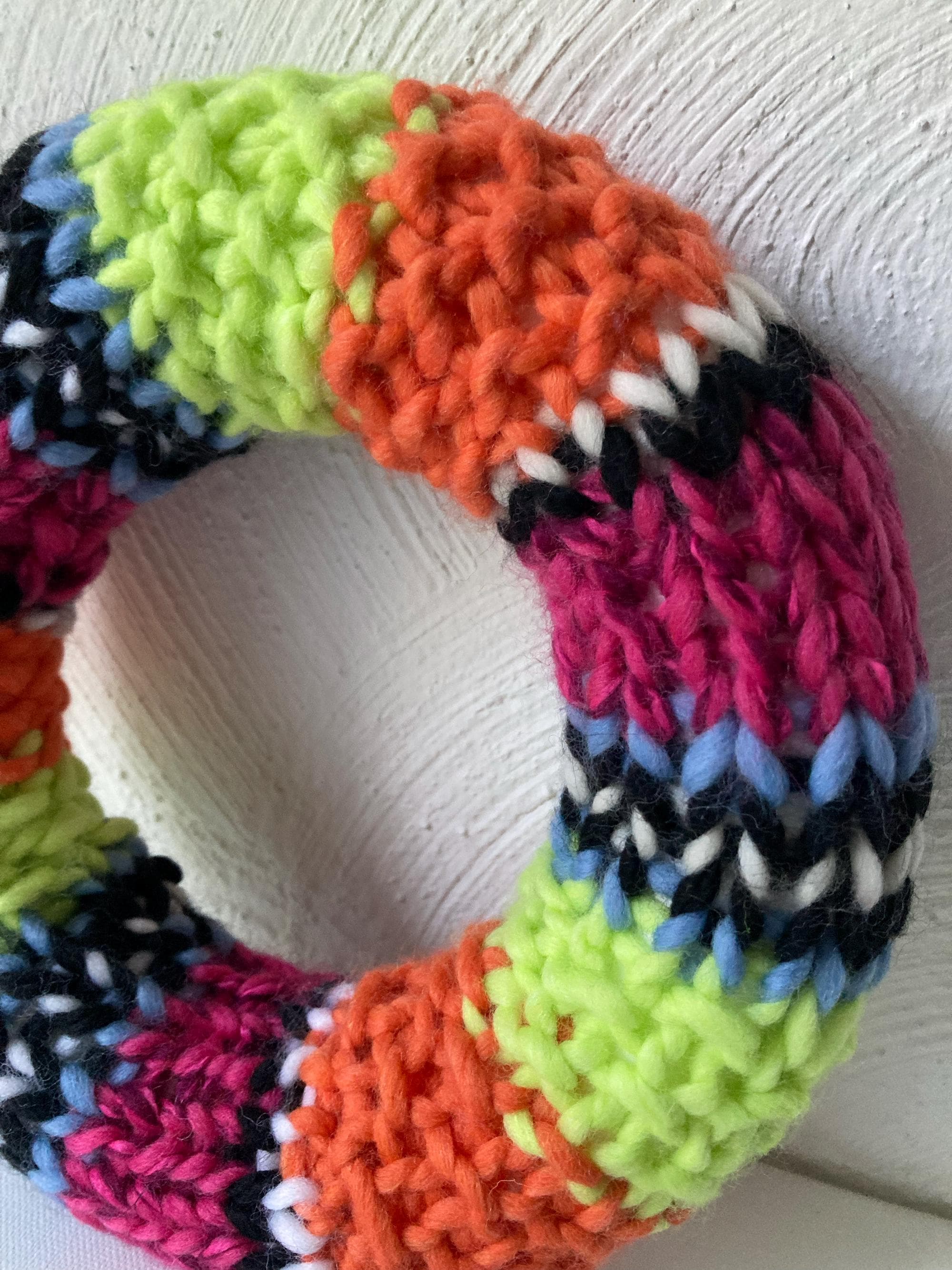 Spring wool wreath in a fresh color mix: orange, pink, blue, and green stripes! Stylish table decoration. Premium handmade, one-of-a-kind piece!